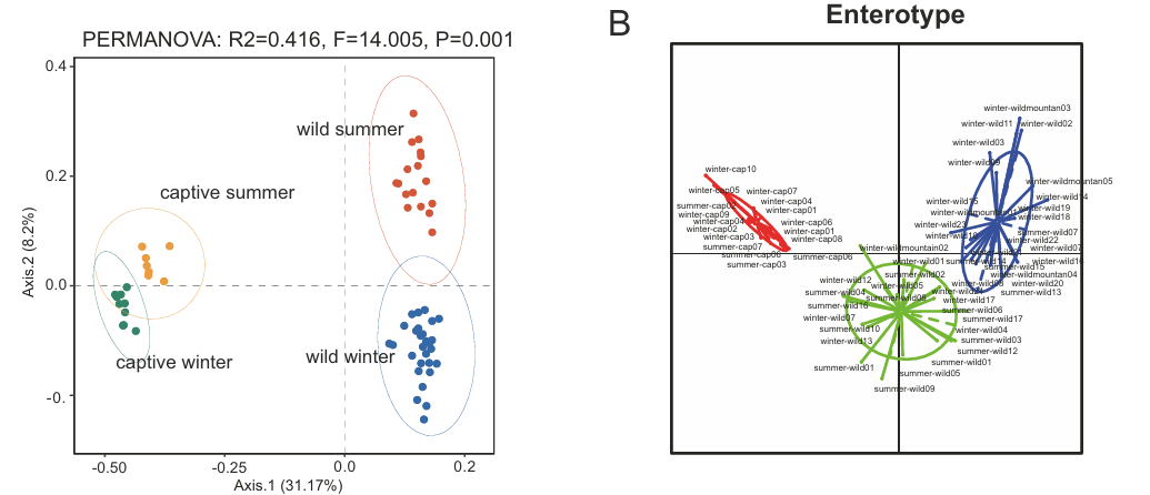 结论:研究结果强调了肠道微生物组在满足宿主在不同环境条件下饮食需求方面的可塑性,为理解野生动物如何通过肠道微生物组适应环境变化提供了新的视角。