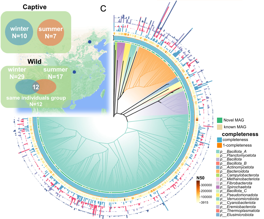 结果:通过对野生和圈养金丝猴粪便样本进行宏基因组和宏转录组分析,研究重建了578个宏基因组组装基因组(MAGs),其中442个(76.5%)在GTDB数据库中没有种水平的匹配,显示了金丝猴肠道微生物组的高度新颖性。野生金丝猴肠道微生物组在夏季表现出更高的多样性,并富集了植物次生化合物代谢相关功能;冬季则富集了地衣多糖降解酶类和毛螺菌科细菌,后者在能量平衡中发挥重要作用。相比之下,饮食稳定的圈养金丝猴肠道微生物组几乎没有季节性变化。栖息地变化也影响了金丝猴微生物群落组装机制和碳循环途径。