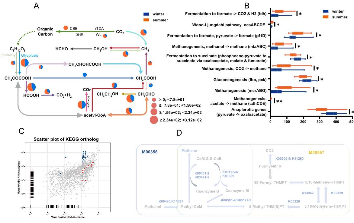 宏转录组分析揭示了基因表达的季节性差异。冬季K02794和K02800基因显著上调,这些基因编码参与甘露醇和甘露糖降解的酶,与地衣消化相关。碳循环分析显示夏季发酵和产甲烷过程更活跃,而冬季糖异生作用增强。甲烷代谢相关基因在冬季转录活性显著上调,主要涉及M00356和M00567通路。