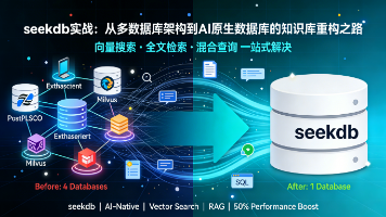 传统 AI 应用往往需要组合多个数据库:PostgreSQL 存储结构化数据,Elasticsearch 做全文搜索,Milvus 做向量检索,Redis 做缓存,这种“拼凑式”架构带来了数据同步复杂、成本高昂、维护困难等问题。2025 年 11 月 18 日,OceanBase 开源了 AI 原生数据库 seekdb,将向量搜索、全文检索和结构化查询整合到一个轻量级数据库中,兼容 MySQL 协