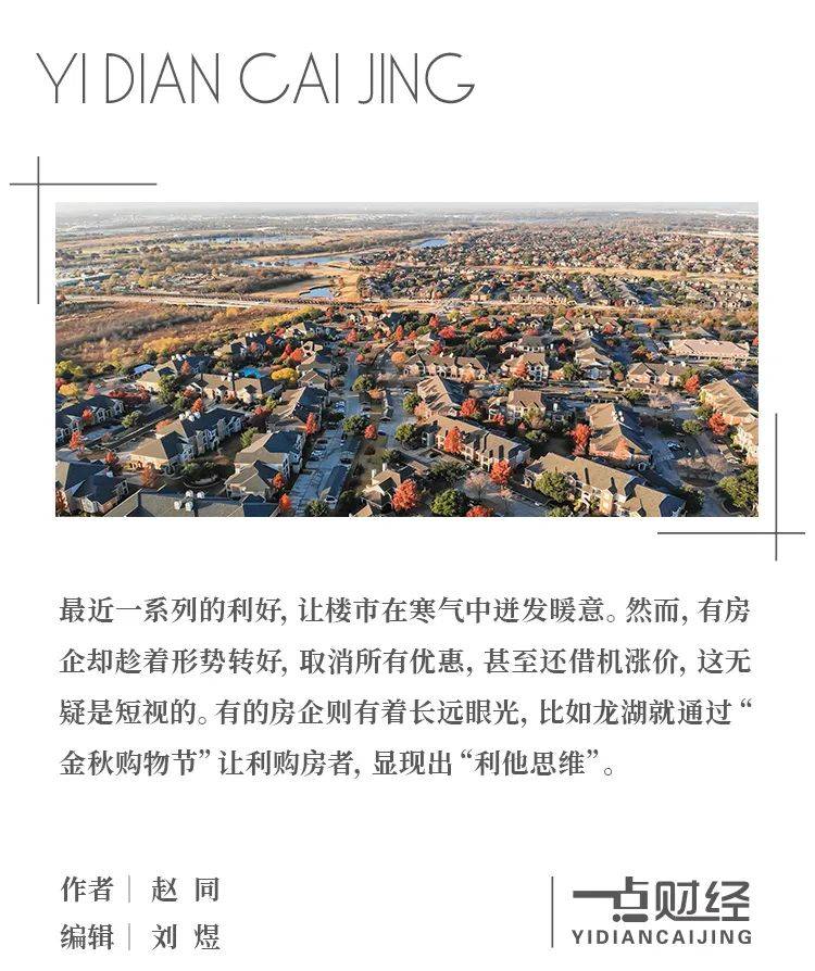 不过,也有些房企的行动,显露出骨子里的“利他主义”。在龙湖的“金秋购房节”活动里,50余个城市的超100个优质项目将为购房人送上福利,包括“城市丰收礼到访送”“认购送999足金黄金”“直播间限时折上99折”等。