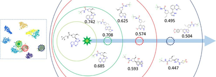 图5. 通过高斯混合分布从参考簇(绿色圆圈)、附近簇(红色圆圈)和远处簇(蓝色圆圈)采样生成的分子。分子下的数字代表与参考化合物的相似性。