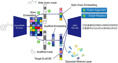 模型的总体结构如下图4所示,使用了双通道信息传递神经网络来编码分子结构及其特性。将骨架嵌入到高斯混合分布的隐空间,保持同簇的骨架属于相同的高斯质心。最后,一个基于门控循环单元(GRU)的解码器用来将嵌入的编码恢复到 SMILES。