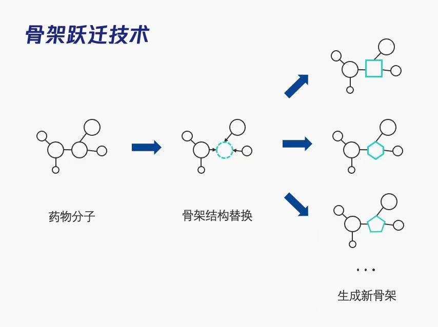骨架跃迁是一种发现结构新颖化合物的策略。“骨架”概念广泛应用于药物化学和药物设计中,分析和比较活性化合物与衍生物的核心结构。骨架跃迁顾名思义,是以已知的活性化合物为起点,通过改变分子的核心结构,获得新颖的化学结构。就像用乐高积木建房子,改造建筑部件或结构,造出更多样化的建筑。