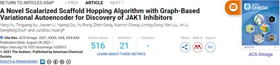 1. Yu, Y. et al. A Novel Scalarized Scaffold Hopping Algorithm with Graph-Based Variational Autoencoder for Discovery of JAK1 Inhibitors. ACS Omega (2021) doi:10.1021/acsomega.1c03613.