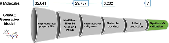 为了缩小评估范围,我们提出了优先级排序流程(下图6)。通过GraphGMVAE生成的数以万计的的生成分子首先通过药物相似性和基于规则的 MedChem 过滤器进行过滤,以去除潜在的有毒性分子或具有反应性的官能团或较差的药物特性的分子。然后,进行药效团筛选、分子对接、3DCNN 活性预测。在上述流程之后,选择了 25 个具有高对接分数和 3DCNN 亲和力分数的分子,进行新颖性检查,根据合成可行性选择了其中的7个分子进行化学合成。
