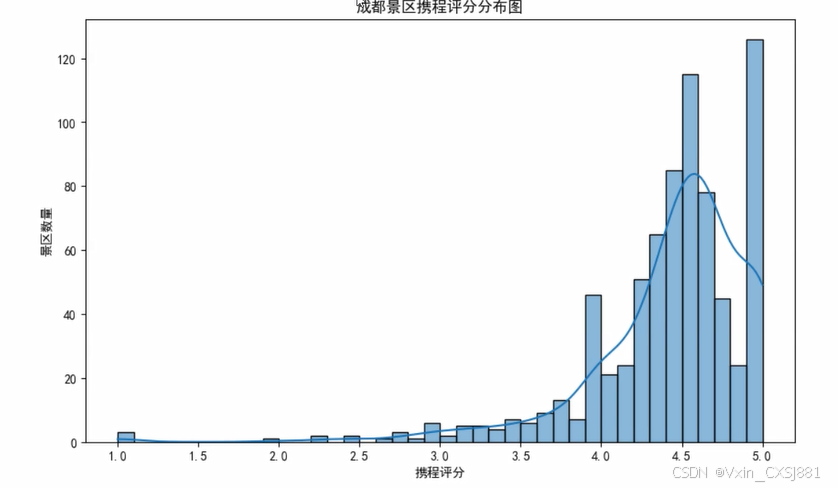 景区评分分布:使用Python的Matplotlib或Seaborn库绘制直方图或箱线图来展示成都市各个景区的评分分布情况,帮助了解景区的整体评价水平。