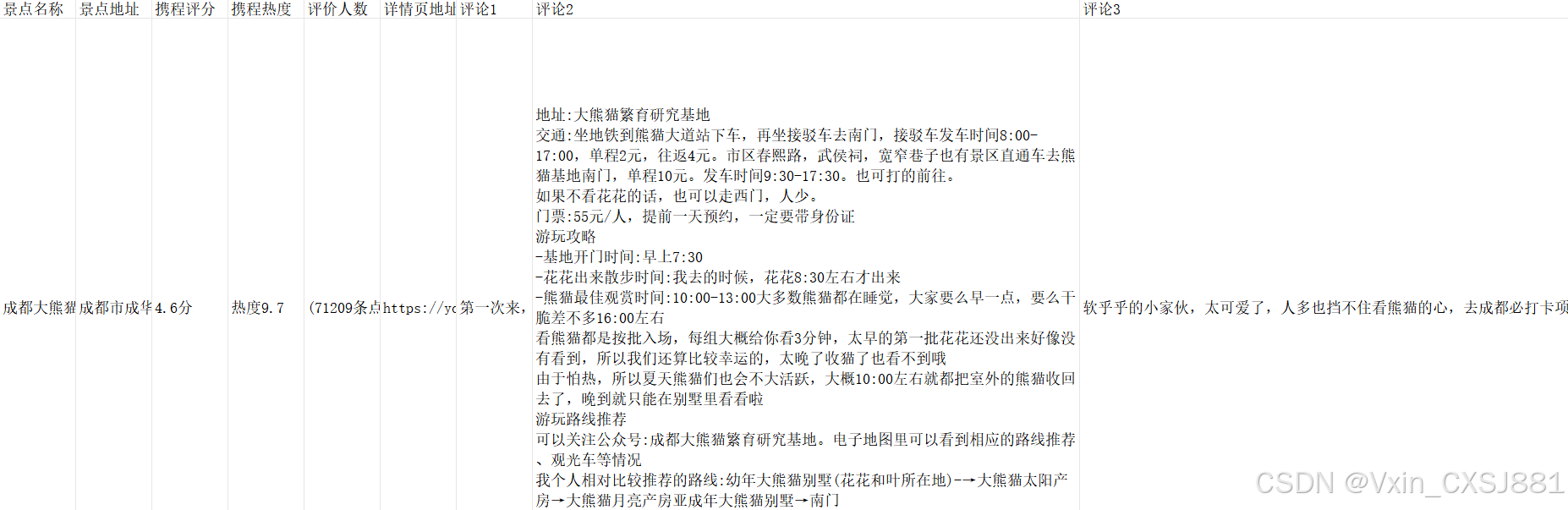 通过Python爬虫,可采集到游客在携程网、景点名称、景点地址、携程热度、携程评分评论的时间以及游客对成都市旅游景区的评分情况等,Python爬虫采集情况见图4.2。