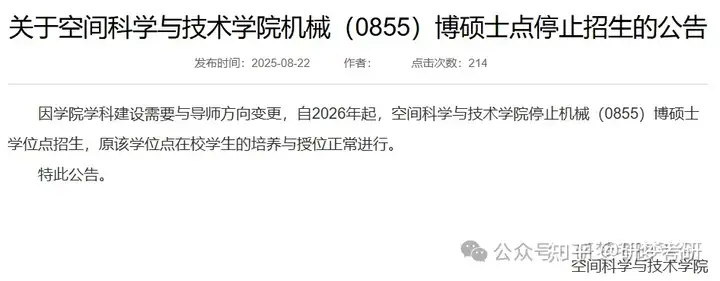 空间科学与技术学院停止机械(0855)博硕士学位点招生