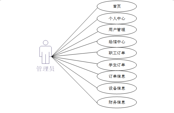 系统中的核心用户是管理员,管理员登录后,通过管理员功能来管理后台系统。主要功能有:首页、个人资料、公共管理(轮播图、公告信息)用户管理(管理员、教职工、学生用户、普通用户)场馆中心、职工订单、学生订单、订单信息、设备信息、财务信息等功能。管理员用例如图3-7所示。