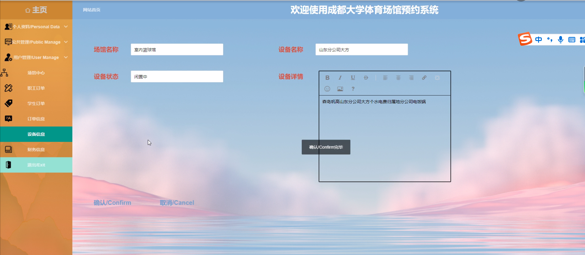 管理员对设备信息管理进行编辑场馆名称、设备名称、设备状态、设备详情等信息并可以进行详情、删除、修改操作。程序效果图如下图5-7所示: