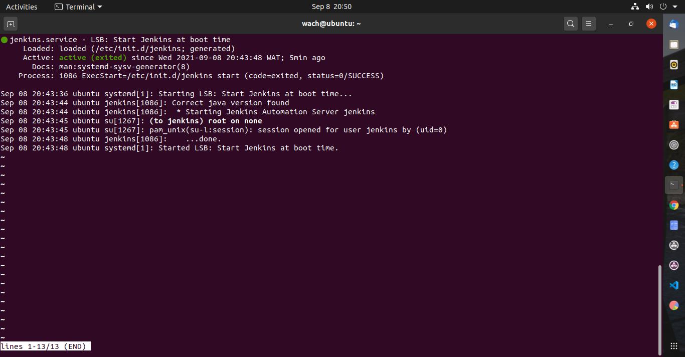 To confirm Jenkins started, its status is checked using: systemctl status jenkins