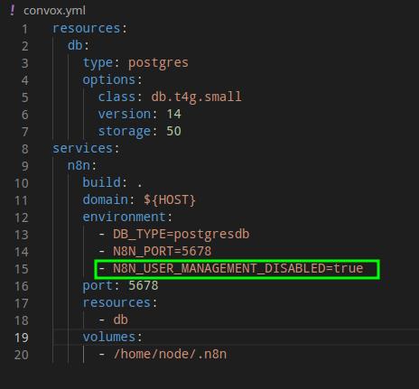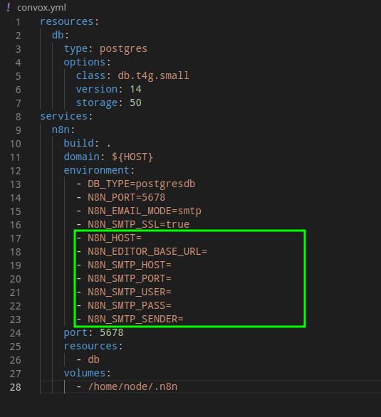 Edit the convox.yml file to define environment variables for n8n: