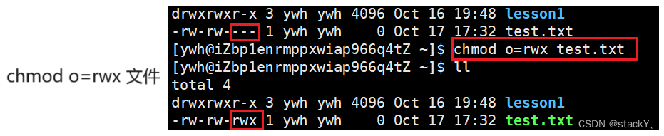 chmod o=rwx 文件:将该文件权限的Other赋予指定的权限