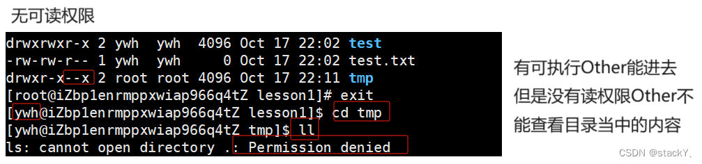 - 可读权限: 如果目录没有可读权限, 则无法用ls等命令查看目录中的文件内容。