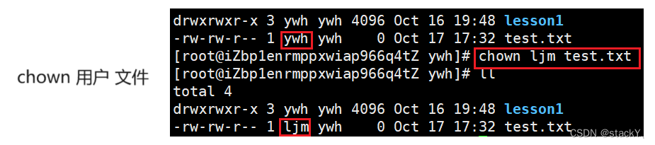 chown 用户 文件:将该文件的拥有者修改为指定用户(root账号操作)