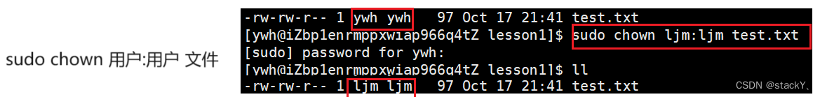 sudo chown 用户:用户 文件:将该文件的拥有者和所属组修改为指定用户