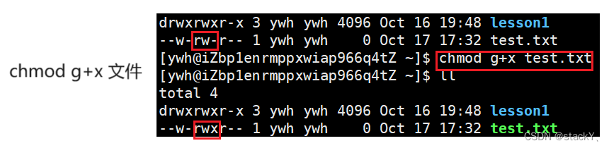 chmod a+x 文件:将文件权限的所有成员都加上可执行权限
