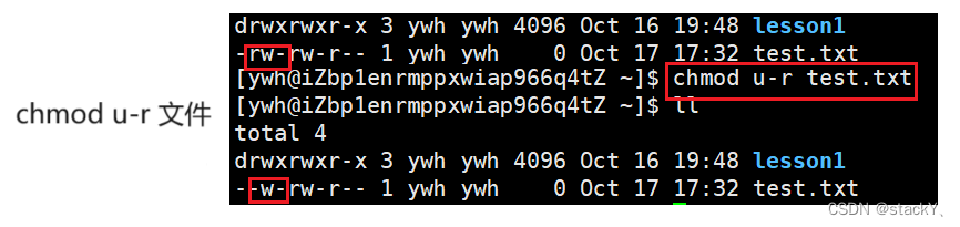 chmod u-r 文件:将该文件权限的拥有者去掉读权限