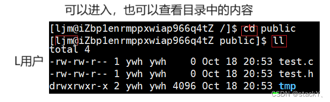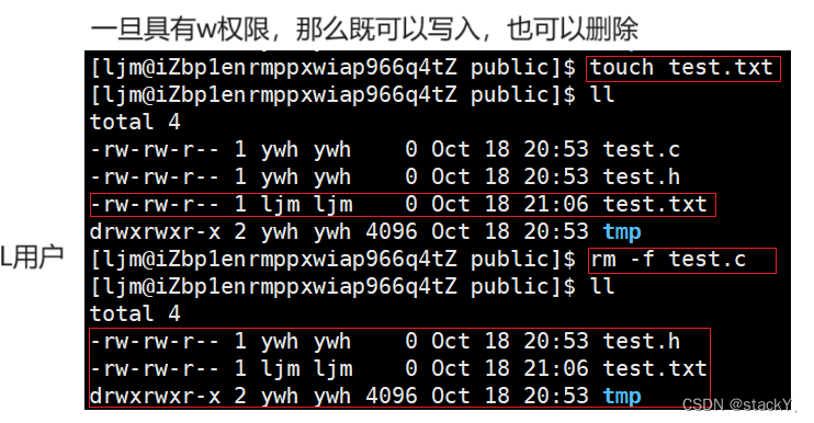 如果L用户也想将自己的数据分享到这个公共目录中,那么就需要拥有w权限,而一旦w权限开放,L用户不仅可以进行写入,也可以进行删除: