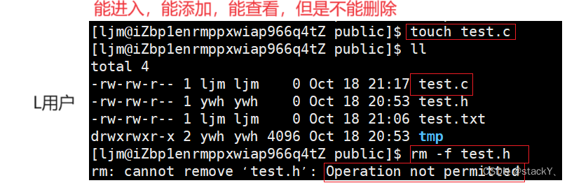 那么这样子就有点不符合实际了,Y用户想要的效果是:L用户可以进入,可以查看,还可以写入,但是万万不能删我文件。那么如果Y用户又取消掉w权限的话,L用户又不能进行写入,那这该怎么办呢?