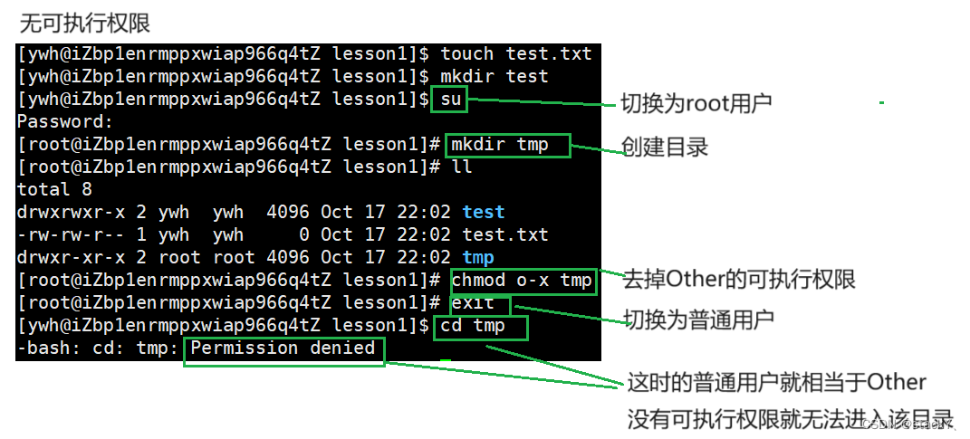 - 可执行权限: 如果目录没有可执行权限, 则无法cd到目录中。