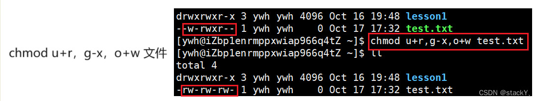 chmod u+r,g-x,o+w 文件:将文件权限的拥有者加上读权限,所属组减去可执行权限,Other加上写权限