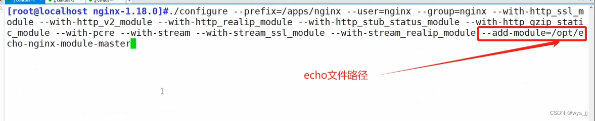 2. ./configure --prefix=/apps/nginx --user=nginx --group=nginx --with-http_ssl_module --with-http_v2_module --with-http_realip_module --with-http_stub_status_module --with-http_gzip_static_module --with-pcre --with-stream --with-stream_ssl_module --with-stream_realip_module --add-module=/opt/echo-nginx-module-master