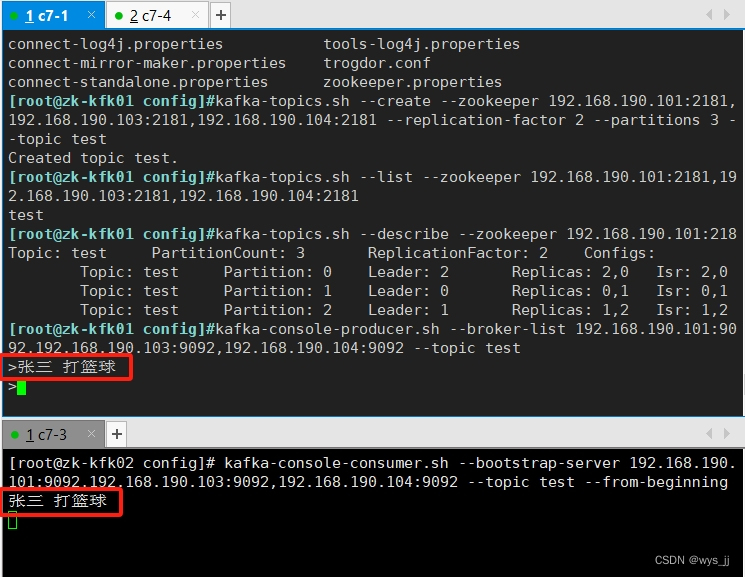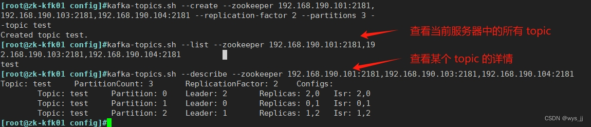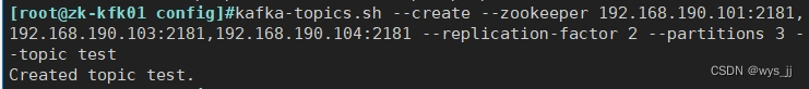kafka-topics.sh --create --zookeeper 192.168.190.101:2181,192.168.190.103:2181,192.168.190.104:2181 --replication-factor 2 --partitions 3 --topic test