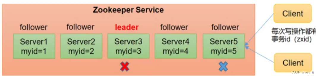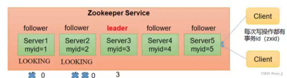 假设zooKeeper由5台服务器组成,SID分别为1、2、3、4、5,ZXID分别为8、8、8、7、7,并且此时sID为3的服务器是Leader。某一时刻,3和5服务器出现故障,因此开始进行Leader选举。