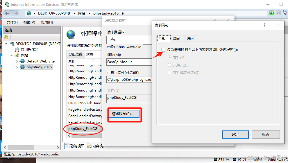 3. IIS -配置⽹站-- 处理程序映射--PHPStudy_FastCGI --请求限制--取消勾