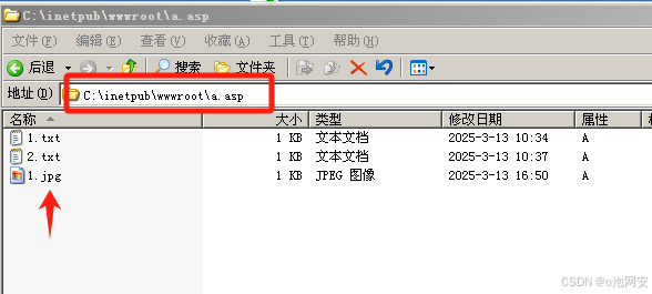 4.将2.jpg⽂件放到⽹站根⽬录下访问,发现其中的asp代码没有被解析。 由此可⻅.asp⽂件夹中的任意⽂件会被当做asp⽂件去执⾏