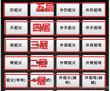 2、利用二分法,当一层选择爷爷,则二层对应的便是爷爷的父亲、母亲;当一层选择的是奶 奶,则二层对应的便是奶奶的父亲、母亲;三层根据二层选择进行对应的父辈、母辈名称 展示,依此类推