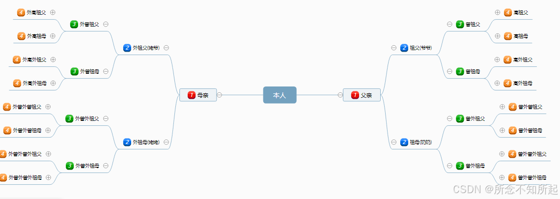 最近有了个任务,将个人的祖宗九代梳理一下,但并不是简单的网上的祖辈九代,而是要把母系也加进去,不止是母亲的父亲,母亲的母亲也要,再深入就是母亲的母亲的母亲。大致如图: