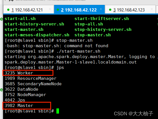 在高可用模式下启动spark集群,先需要在任意一台主节点(master)执行start-all.sh,然后再另外一台主节点(slave1)单独执行start-master.sh