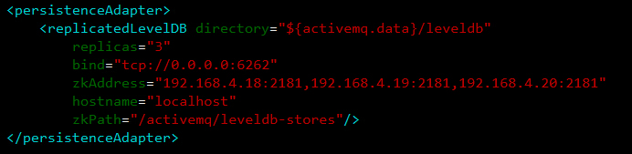 后面需要修改的配置文件都在ACTIVEMQ_HOME/conf文件夹下。首先修改每个ActiveMQ的持久化方式(修改ACTIVEMQ_HOME/bin/activemq.xml文件),ActiveMQ默认使用的是kahaDB作为持久化存储数据的,这里修改成levelDB。如下图所示: