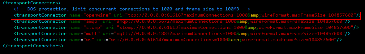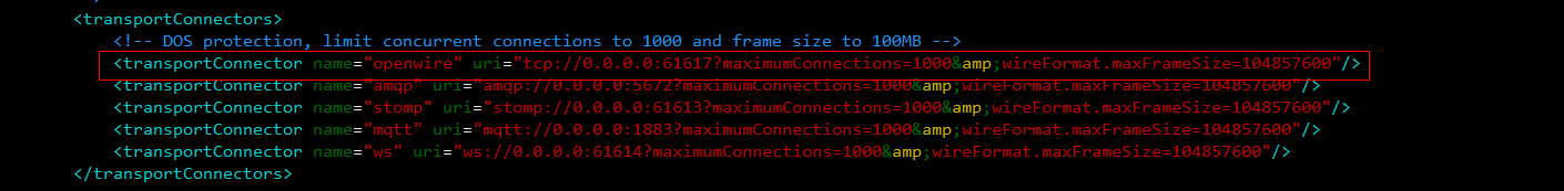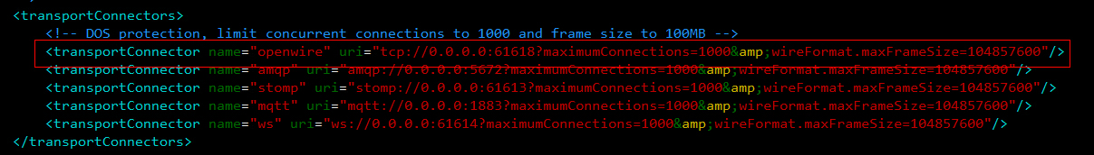 接下来修改ActiveMQ的TCP链接端口号,activemq-1使用默认的61616端口,activemq-2修改为61617,activemq-3修改为61618。如下图所示(注意红框部分):