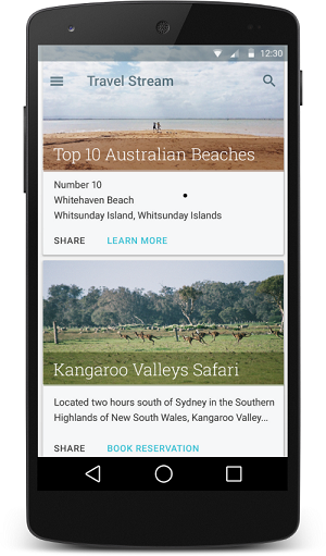 CardView提供了一个默认的elevation(意为CardView的Z轴阴影)和圆角角度,所以每一个卡片都能够在不同的设备上保持相同的外观。然而,你也可以根据自己的需求去定制这些值。