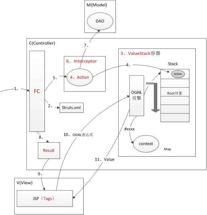 写在前面:Struts2主要包含前端控制器FC、Action、ValueStack容器、Result、Interceptor拦截器、Tags标签6个核心组件,本文主要介绍这几个组件的合作关系,由此构成Struts2的工作流程,以便更好地理解和使用Struts2。