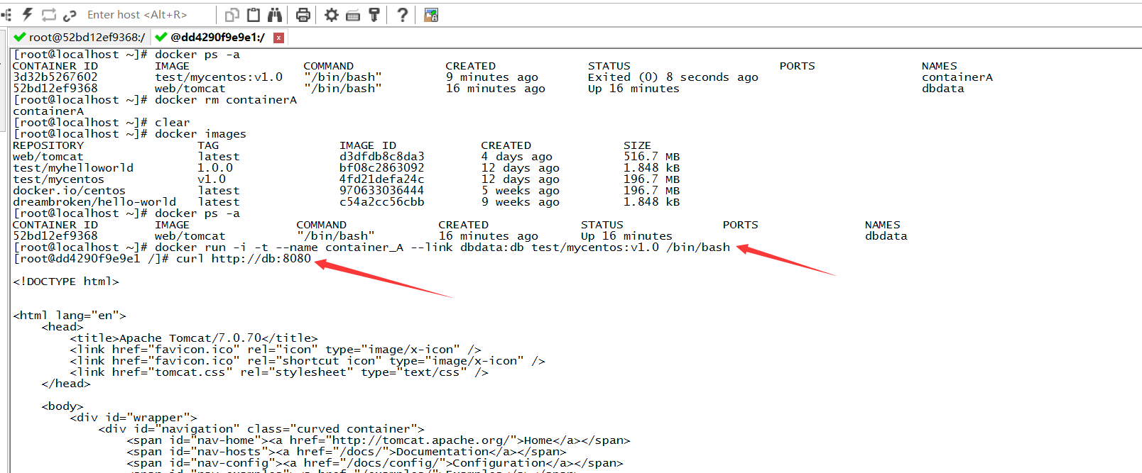 创建一个容器container_A,并且--link到dbdata:db,然后通过curl http://db:8080测试,看是否能访问到dbdata。