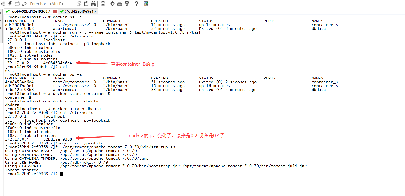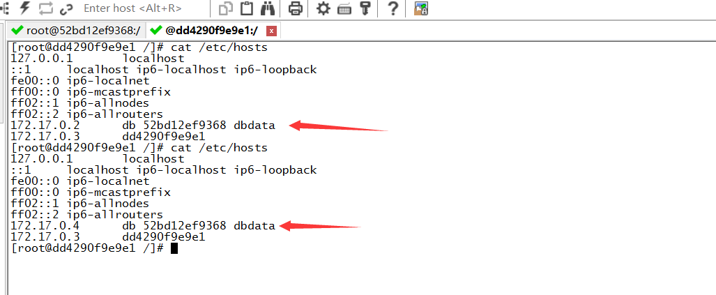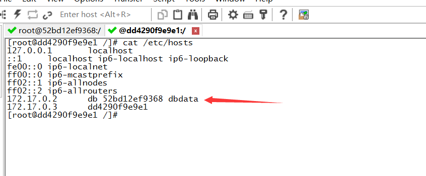 发现container_A的/etc/hosts文件中写明了如果是db/dbdata/容器id都会解析到172.17.0.2上。那就有点疑问了,container_A的hosts文件写死了dbdata的ip,那如果dbdata的ip发生了变化呢?难道container_A也要重启吗?那把dbdata停止,然后重启(重启前,先创建另一个容器B,作用是占用dbdata的ip,这样重启dbdata时,dbdata的ip应该就是新的)。