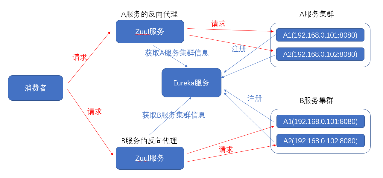 在前面学习ribbon,feign的时候,向api提供者发起请求的时候,实际用的是http://提供者服务名称这形式,如果提供者api自身进行了集群,没有使用类似nginx的反向代理,而消费者又没有连接eureka的话,那就麻烦了。spring cloud中的zuul其中的一个功能就担任了反向代理的功能,还能连接eureka进行服务发现。