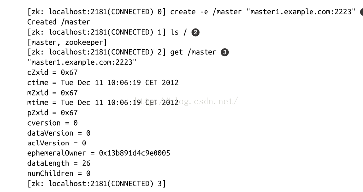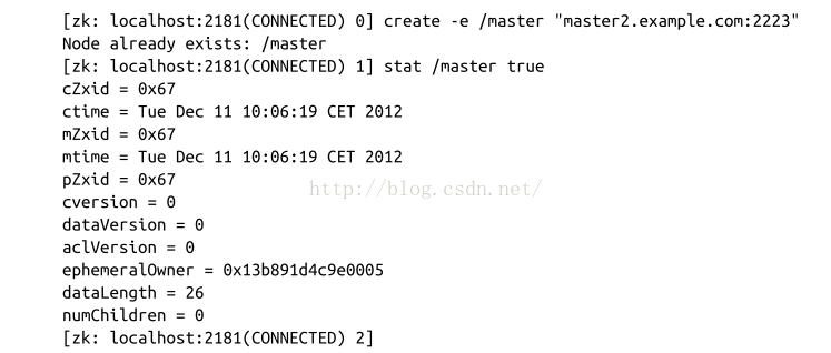 上面操作中,我们创建了一个临时的节点/master,并且让该节点保存了一些主机的信息,上面的-e参数表明了我们创建的是一个临时的节点。