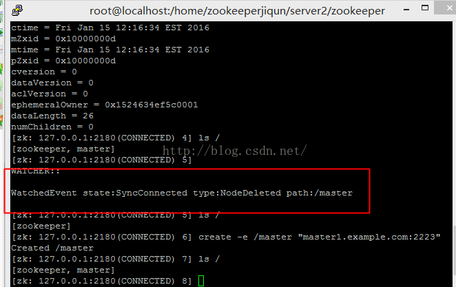 当再次创建/master时,告诉我们已经存在,此时,我们在此节点上创建一个监听,用stat命令操作,此时关闭刚才的进程,我们在当前的进程中会看到如下的提示内容