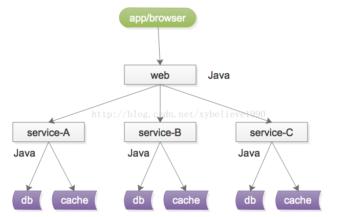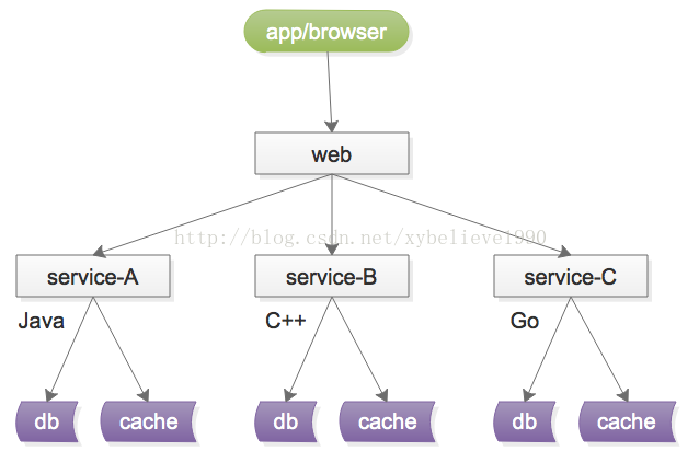 服务化的一个好处就是,不限定服务的提供方使用什么技术选型,能够实现大公司跨团队的技术解耦,如下图: