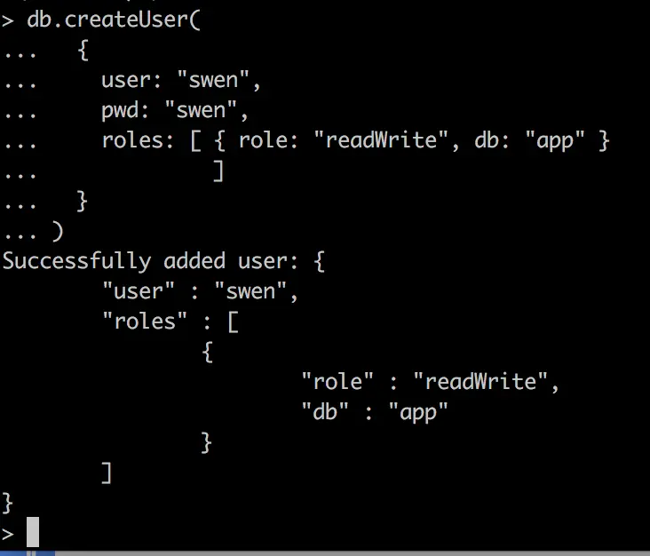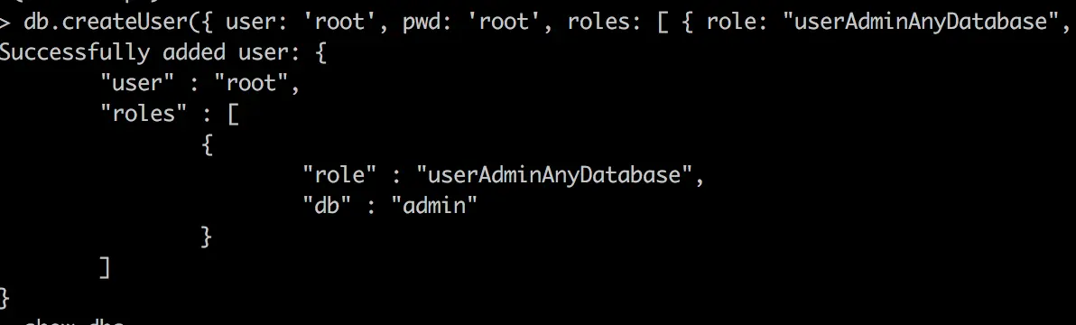 db.createUser({ user: 'root', pwd: 'root', roles: [ { role: "userAdminAnyDatabase", db: "admin" } ] })