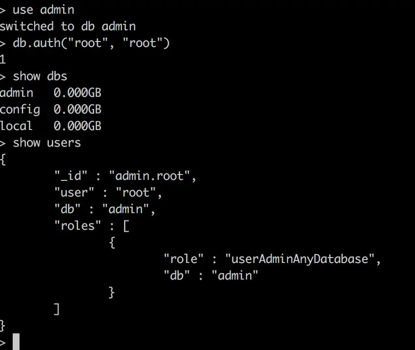 如上,可以看到root用户创建成功。exit退出mongo命令行,带验证的mongodb已经创建成功。