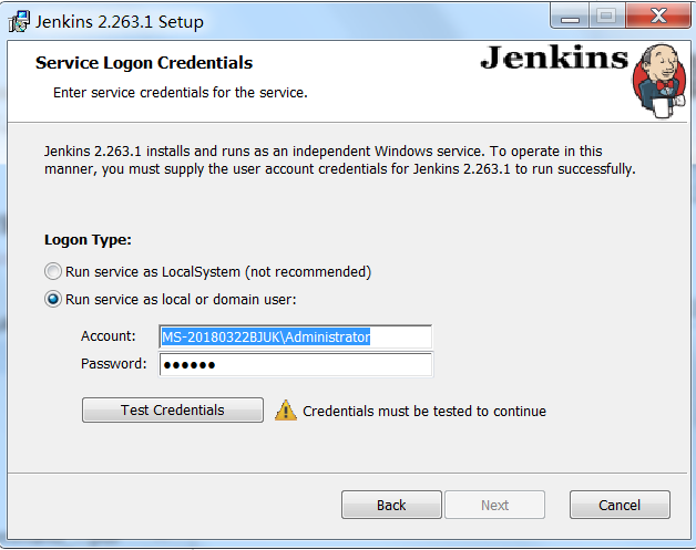 本人测试未过,使用LocalSystem进行安装。